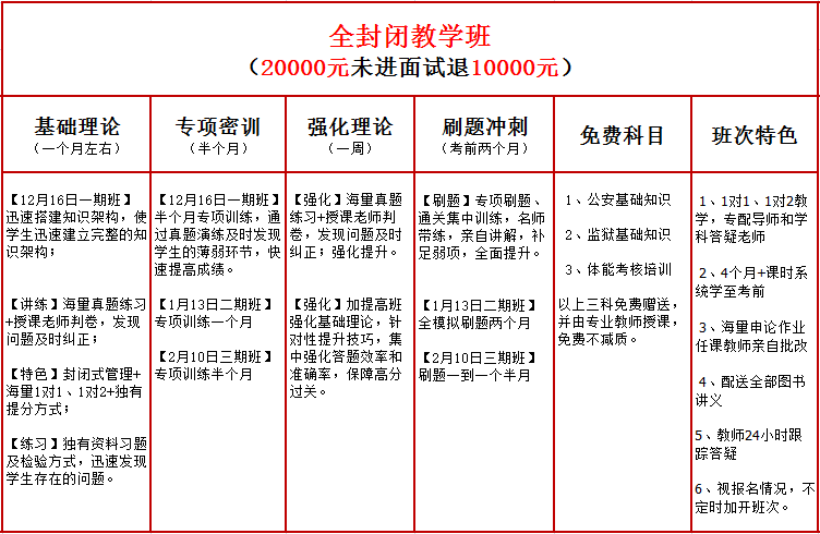 全年班(整年學(xué)習(xí)),學(xué)習(xí)3次課。所有教案,卷子,題庫都免費發(fā)放。大概1000元的資料大放送,公安基礎(chǔ)監(jiān)獄基礎(chǔ)免費!